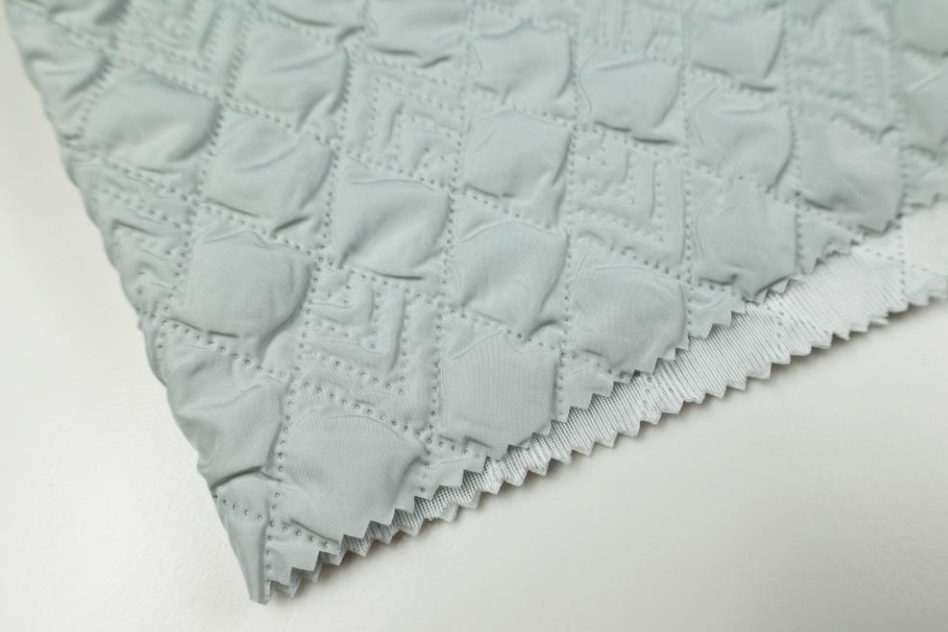 產(chǎn)品原料是應(yīng)用定制生產(chǎn)的27D多孔聚酯纖維,面料的密度高達(dá)450T;面料絲絨的絨感,手感柔軟,不易變形;外觀是無針無線無膠特點,整體提升了面料的防棉性和保暖性;豐富多樣的花紋圖案,打造出3D肌理,契合時尚趨勢。